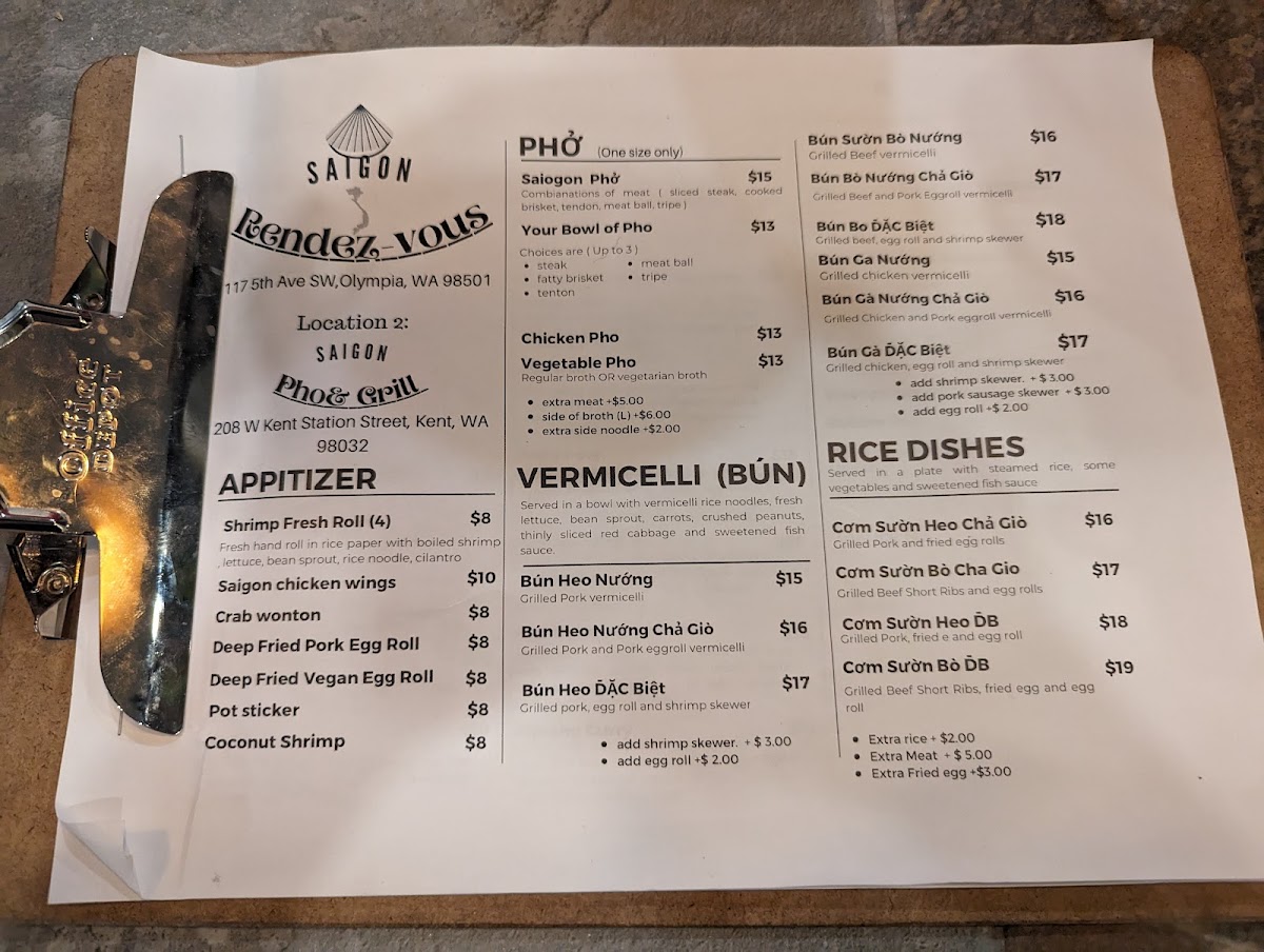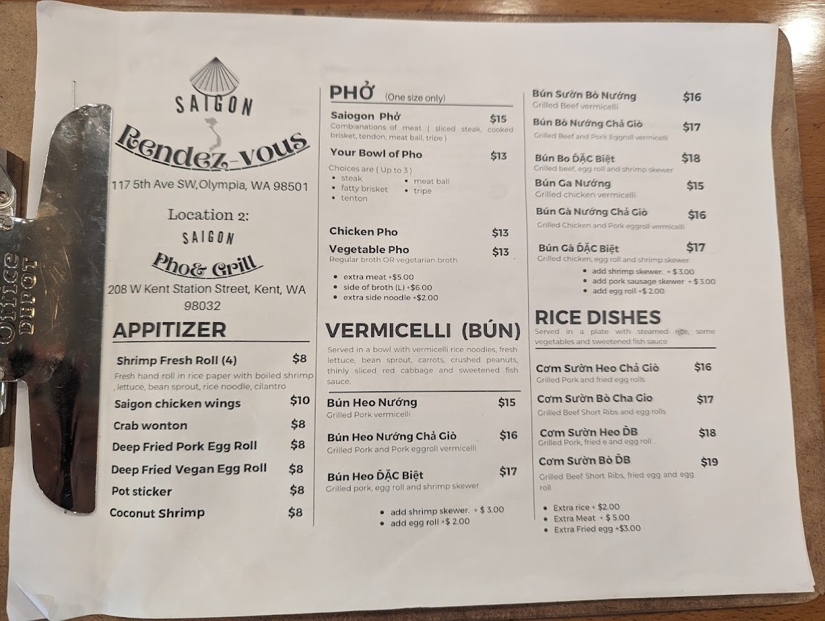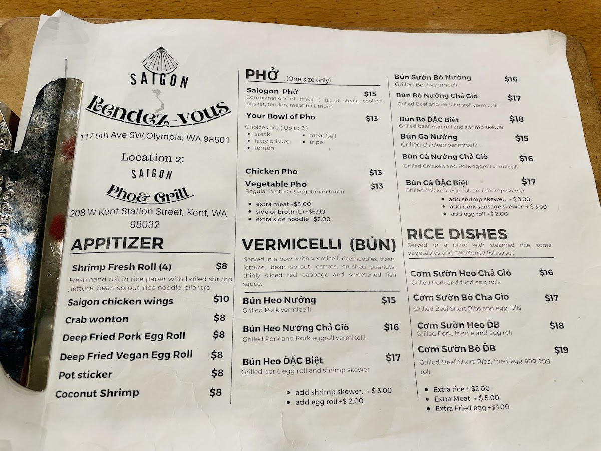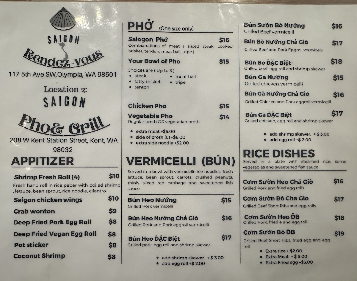 The menu at Pho Na (Saigon Rendezvous) offers a laid-back yet thoughtfully composed selection of Vietnamese and Thai dishes, perfect for casual dining or a relaxed meal out. It features comforting noodle soups like the classic Beef Brisket Pho or the flavorful Steak Pho, alongside fresh and light options such as Shrimp Fresh Rolls and Vegetarian Egg Rolls.