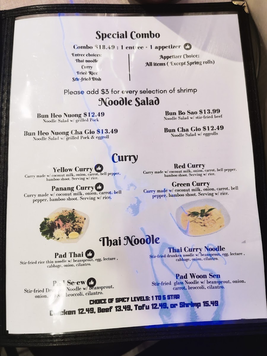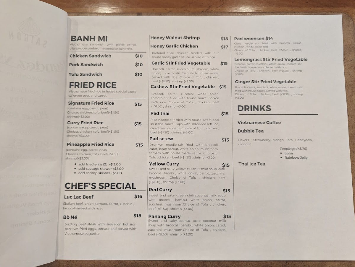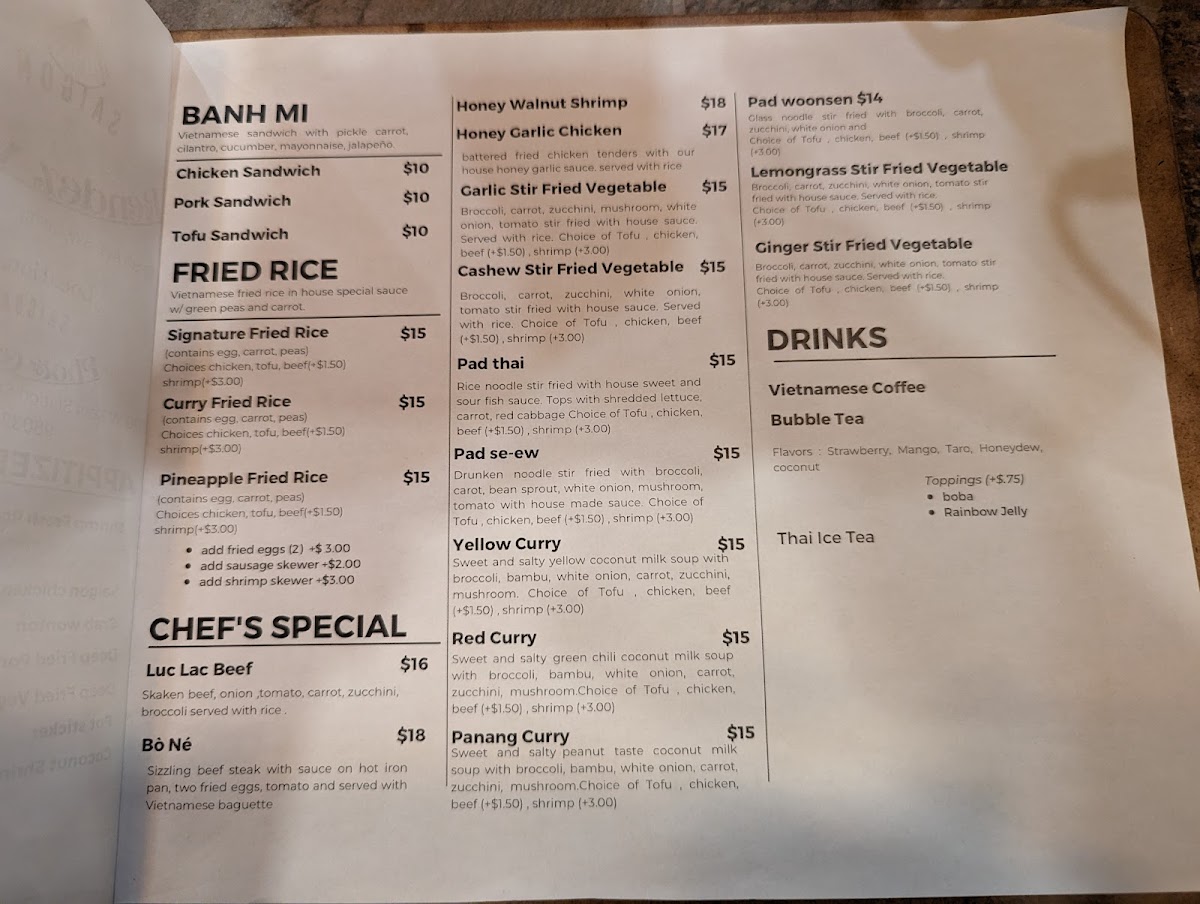 On the drink side, warm or iced Thai Tea and Vietnamese Iced Coffee offer comforting, familiar flavors that complement the overall experience. Whether stopping by for a quick lunch, catching up over dinner, or enjoying a casual evening out, the menu’s balance of fresh, savory, and comforting items reflects the approachable and relaxed vibe of the space.